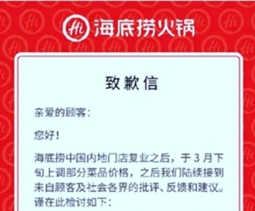 海底捞方面称,中国内地门店复业之后,于3月下旬上调部分菜品价格,之后陆续接到来自顾客及社会各界的批评、反馈和建议。