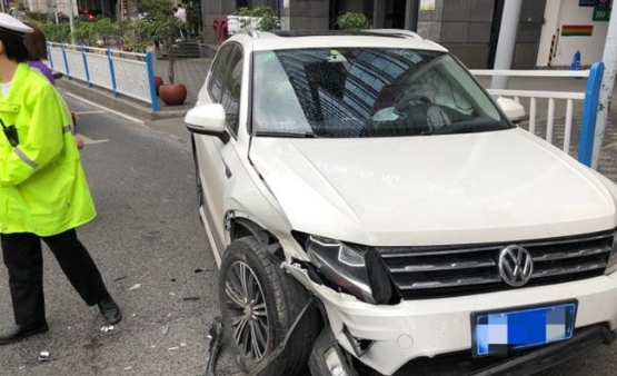 据了解,事发当时莫某驾驶白色越野车从沧白路一停车库驶出,在未观察主干道直行来车情况下,径直开出上道,瞬间跟沿左道直行的一辆黑色小轿车发生猛烈碰撞。黑色轿车安全气囊全部弹开,阻碍了驾驶员刘某踩刹车,黑色轿车继续向前行驶,直到撞到道路右侧护栏后才停了下来。