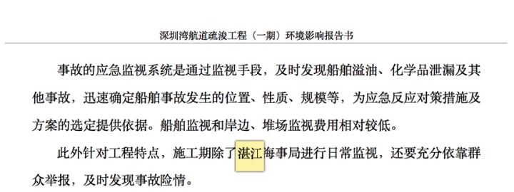 澎湃新闻(www.thepaper.cn)此前报道,近日,深圳市交通运输局官网发布的深圳湾航道疏浚工程(一期)环评报告书被指涉嫌抄袭。报告书多处出现湛江字眼,涉嫌抄袭湛江航道疏浚项目环评,例如,环评中写道“深圳湾航道疏浚工程是落实湛江市国民经济和社会发展‘十三五’规划的体现”,“项目建设可实现‘以湛江港为龙头,充分发挥其作为西南沿海地区主枢纽港的辐射功能,在湛江湾、雷州等地布局建设若干港口物流基地’的目标”。在项目生态评价上竟然出现了“项目不会对湛江湾现有红树林造成明显不利影响”等字眼。