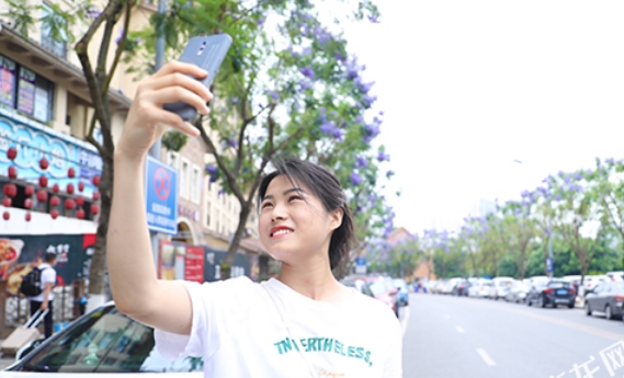 华龙网-新重庆客户端5月22日15时30分讯(记者 谢鹏)又是一年蓝花楹开时! 今(22)日,华龙网-新重庆客户端记者来到重庆大学城景和路,一公里的紫色花海带来了一场视觉盛宴,许多市民、游客纷纷掏出手机拍照打卡。