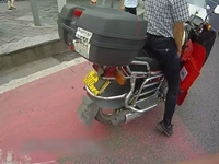 原来,该摩托车牌照上方吊着一根长约30cm,宽约10cm的带子,从储物箱的位置垂下来,将牌照挡住。更神的是,带子的下方连了一根不太明显的线,这根线顺着车身连到油箱右侧的位置,驾驶员可以通过用手拉线来控制带子的收放,进而达到遮挡号牌的目的。