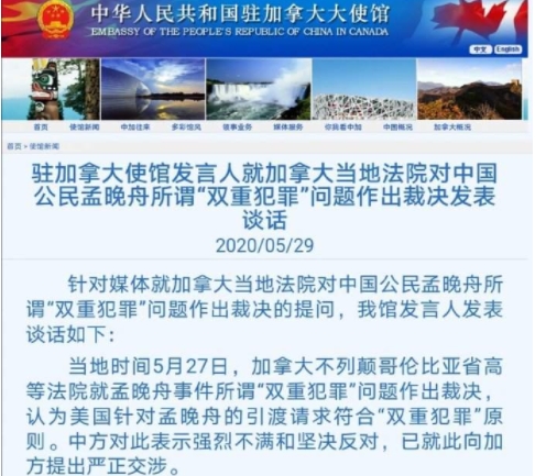 当地时间29日,中国驻加拿大使馆网站发布声明:加拿大不列颠哥伦比亚省高等法院认为美国针对孟晚舟的引渡请求符合“双重犯罪”原则。中方对此表示强烈不满和坚决反对,已就此向加方提出严正交涉。美加滥用双边引渡条约,对中国公民任意采取强制措施,严重侵犯了中国公民的合法权益。美方的目的是为了打压中国高科技企业和华为,加拿大扮演了美方帮凶的角色,这是一起严重的政治事件。我们再次敦促加方认真对待中方的严正立场和关切,立即释放孟晚舟女士并让她平安回到中国,不要在错误的道路上越走越远。