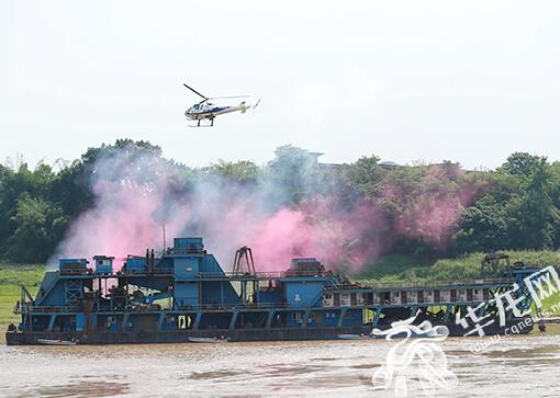 华龙网-新重庆客户端6月8日11时讯(记者 阙影)水下静候,蛙人伺机出击;旋翼轰鸣,特警从天而降;警艇破浪,攻坚小组突击制敌……近日,重庆警方2020年水上实战大练兵如警匪大片在长江重庆巴南木洞镇水域精彩上演。