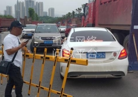 马路上设有闸杆,现场工作人员对过往车辆进行询问。华龙网-新重庆客户端记者 王春光 摄
