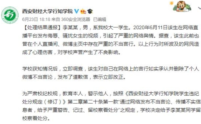 通报称,李某某系西安财经大学行知学院大一学生。2020年6月11日该生在网络直播平台发布侮辱、骚扰女生的视频,引起了严重的网络舆情。据查,该生此前也曾在个人直播间、微博主页中存在严重的不当言行。以上行为对所波及的网民造成了心理伤害,对学校声誉产生了不良影响。