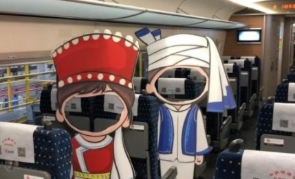 在重庆西动车所,重庆客运段的工作人员将提前准备到了各种装饰板,放置进了车厢,并贴上了宣传重庆和大理旅游的相关窗贴。