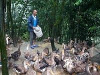 綦江区三角镇中坝村村民蒋明伦正在给鸭子喂饲料,他家今年养了500只鸭。华龙网-新重庆客户端记者 石涛 摄
