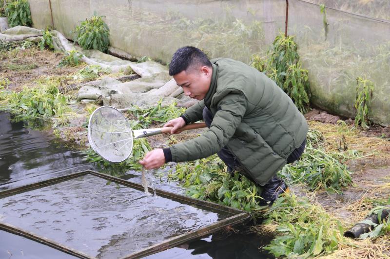 王炯创业不忘乡亲,基地采用“土地租赁+返聘务工”模式,鼓励和引导村上农户将土地经营权有序流转,将土地流转后释放的劳动力返聘到产业基地务工,让农户变成产业工人,农户得到了土地租金和务工薪金,拓宽农户增收渠道。据王炯介绍道,基地最忙的的时候,先后吸纳二十多名农户到基地务工,他还无偿为前来购买黑斑蛙苗的养殖户提供技术指导,实现了经济效益和社会效益的双丰收。