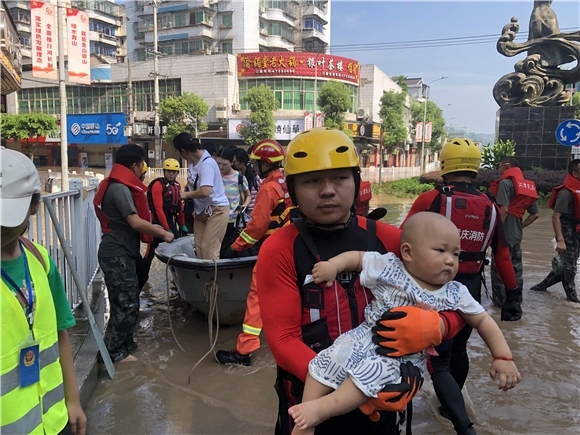在白沙镇麻柳湾社区一带,消防员迅速与当地政府工作人员一道,不断喊话,并使用冲锋舟运载,将被困群众陆续转移到安全地带。