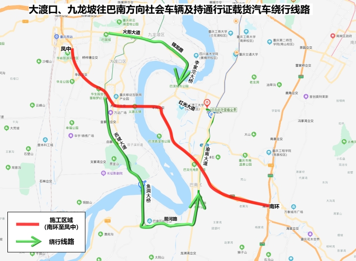 大渡口、九龙坡往巴南方向行驶的社会车辆及持通行证载货汽车请绕行:西城大道-鱼洞长江大桥-箭河路-渝南大道-巴南方向或西城大道-火炬大道-锦龙路-李家沱长江大桥-红光大道-巴南方向。