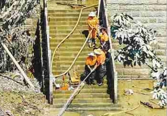 8月23日,磁器口景区,洪水退去后,环卫工人、市政工作人员等正在加紧清淤。记者 齐岚森 摄/视觉重庆