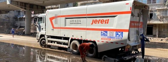 由于近日重庆晴热天气持续,在灼热阳光照射下,洪水退去后形成的污泥很快便风干变硬,这给清淤工作带来了极大的不便。重庆市渝中区环境卫生管理服务中心使用的这台深度清洁车,是专门用于城市道路深层污垢清洁的高端设备。该车辆既能采用高压水旋转清扫专利装置,又能使用高负压多级风机真空抽吸系统,同时具有雾化喷洒、消杀冲洗等多种功能,可以将道路缝隙中的积垢彻底清理干净,有效切断细菌、病毒的沉降途径。