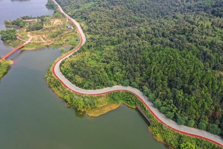 这是9月2日在重庆市铜梁区玄天湖拍摄的西郊绿道(无人机照片)。新华社记者 黄伟 摄