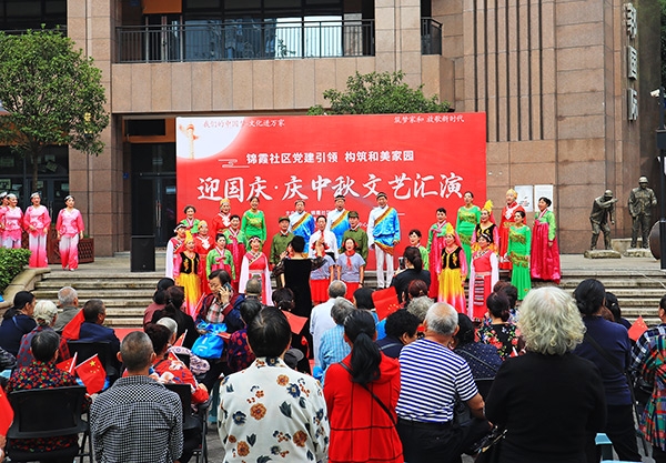 文艺汇演在《没有共产党就没有新中国》的歌声中拉开帷幕,200多位社区居民聚在一起,挥动国旗,共庆国庆、中秋佳节。