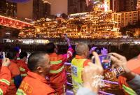 两江游游轮经过洪崖洞时,环卫工人们纷纷拿出手机拍摄。华龙网-新重庆客户端记者 张质 摄