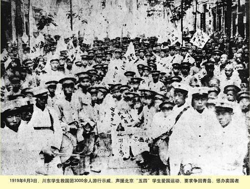 ▲1919年3月,川东学生救国团3000余人游行示威,声援北京"五四"学生爱国运动,要求争回青岛,惩办卖国贼。