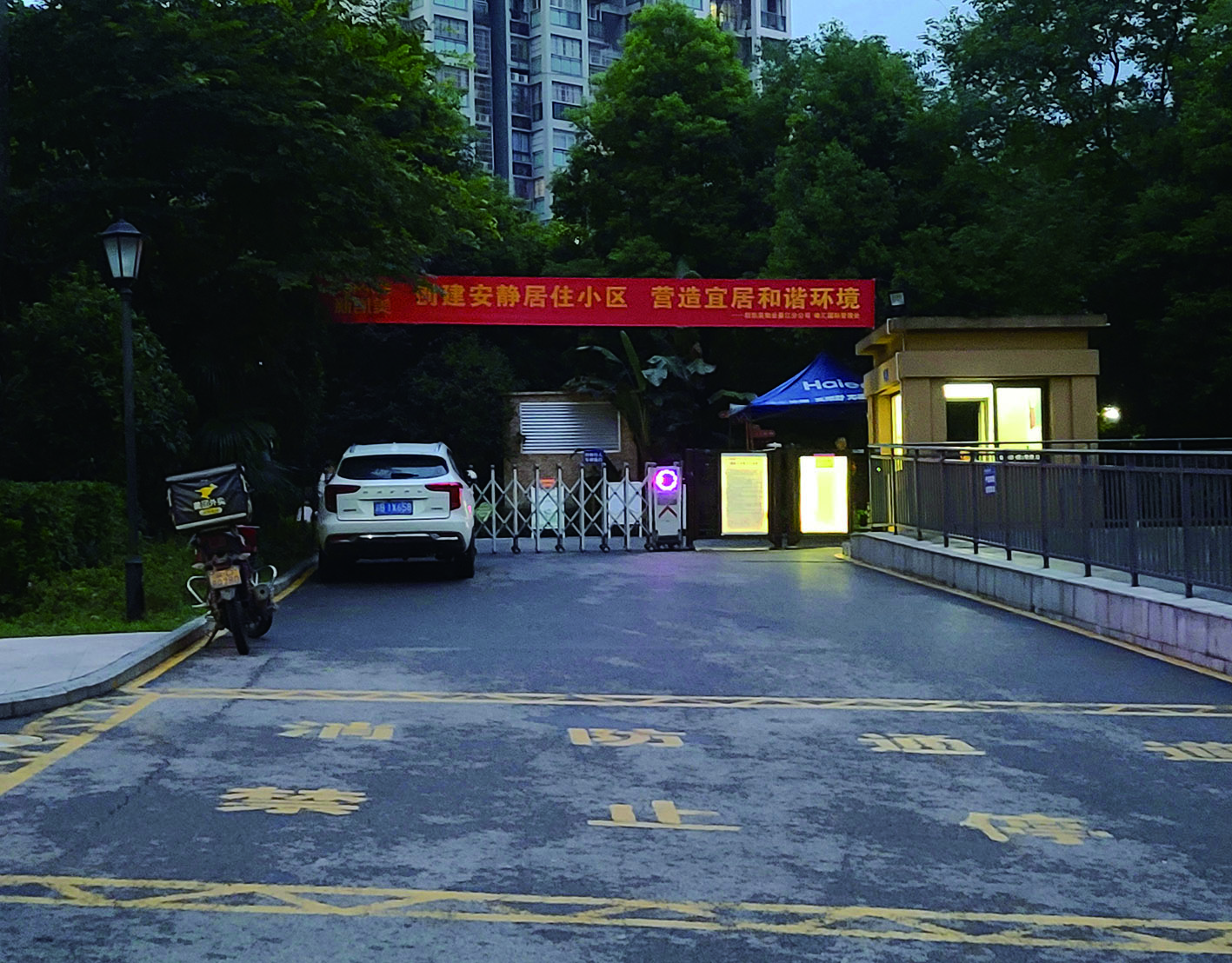 8月26日晚,通惠街道峰汇国际小区南门,地面上的“消防通道、禁止停车”黄色大字非常醒目,可这辆白色小车和摩托车车主却视而不见,仍然把车停在了小区门口。