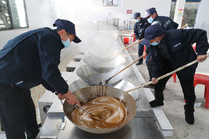 随着甘蔗汁在大锅中翻滚,室内开始飘起水雾,一股浓浓的香甜味氤氲开来。4名村民戴着口罩,手持长杆铁勺,不停地在锅里来回搅动。
