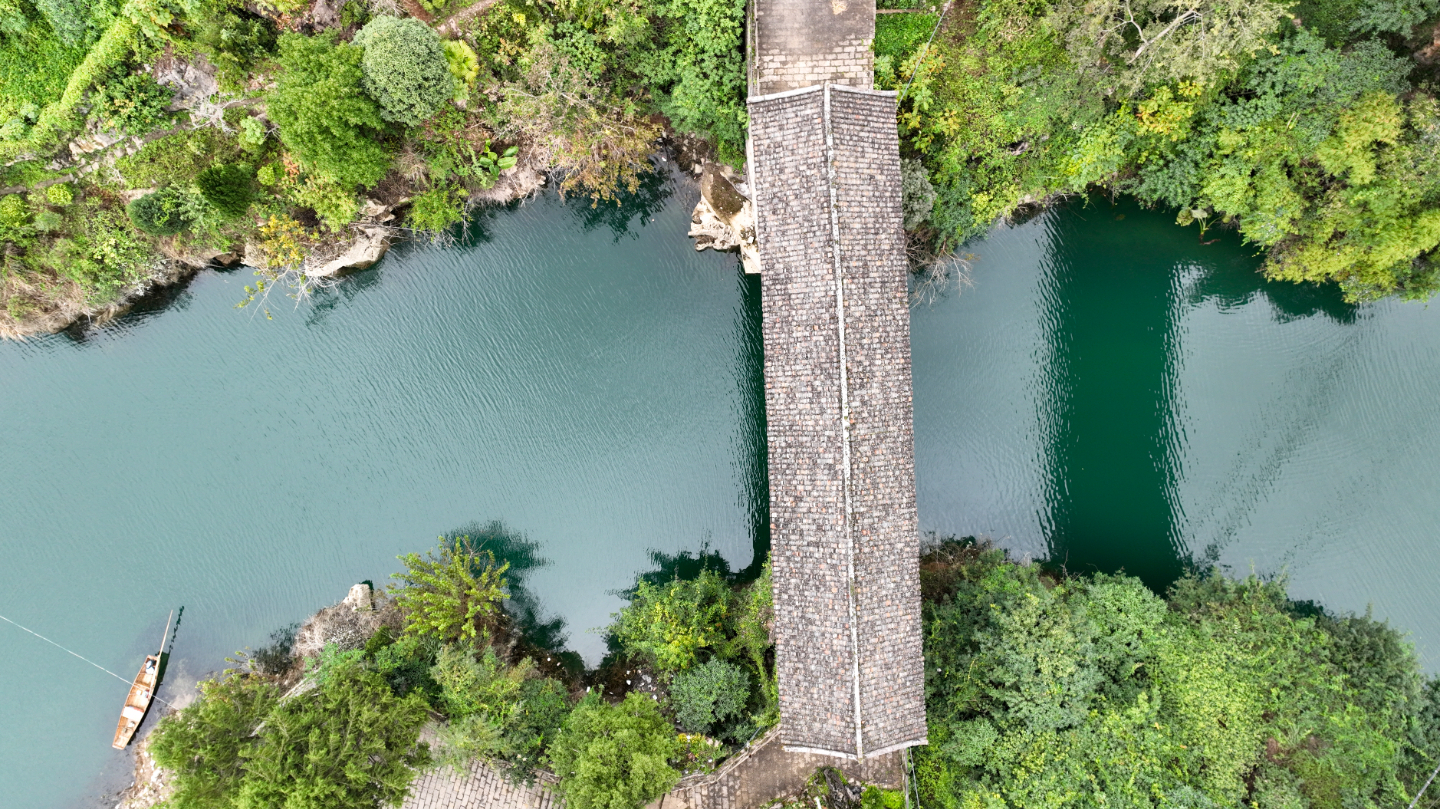 该桥修建于清同治十年(1871年),已有153年历史。廊桥长32米、宽4米,桥上有9间瓦房,两侧是木栏杆。廊桥修建工艺精湛,从桥下25米跨度的木拱到桥面上的柱梁、地板和两侧的木栏杆,没有一颗铁钉和螺丝,全部用公母榫配合固定。(邱洪斌/摄)