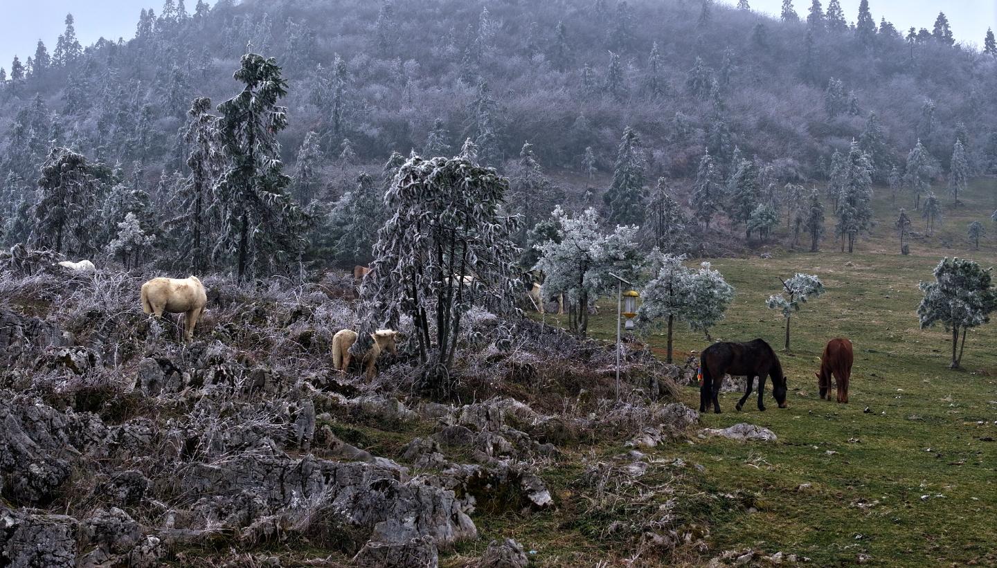 近几天,在海拔1400余米的菖蒲盖,气温降至—3℃。从空中俯瞰,连绵群山仿佛披上了一层冰晶外衣,轻盈洁白的雾凇附着在丛林之上,如玉树琼花,将连绵群山装点得如同一幅水墨山水画。奔跑的马儿,更是给这方景色增添了几分灵动之美。