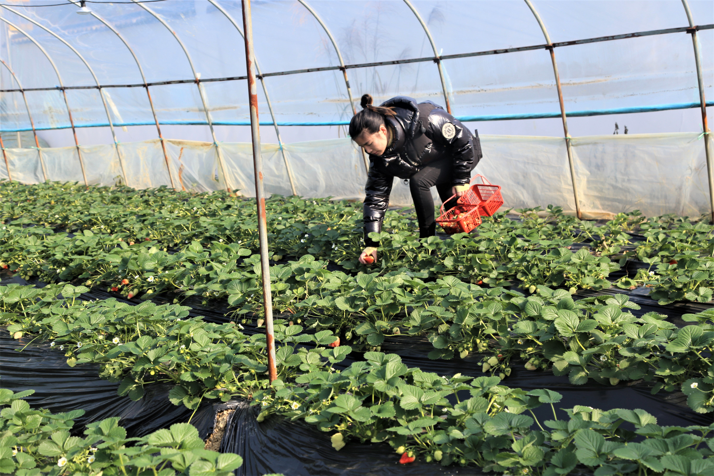 酉阳发布讯 “哇,这个棚子里的草莓红得好漂亮。”12月16日,在龙潭镇渤海村3组草莓基地里市民石女士正跟朋友采摘草莓,她们提着篮子,高兴地钻进一个个草莓大棚,一边欢呼,一边将鲜红欲滴的草莓摘下放进篮子里。