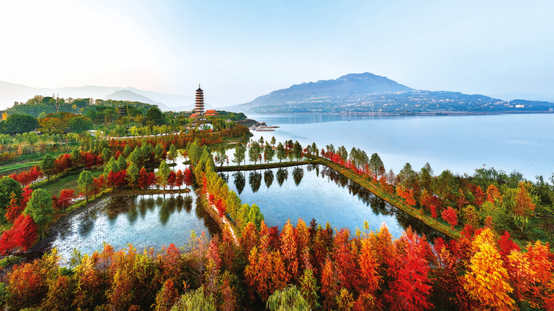 12月16日,汉丰湖国家湿地公园叠翠流金、色彩斑斓,碧水、彩林在蓝天的映衬下,美如油画,给冬日增添了无限生机和活力。