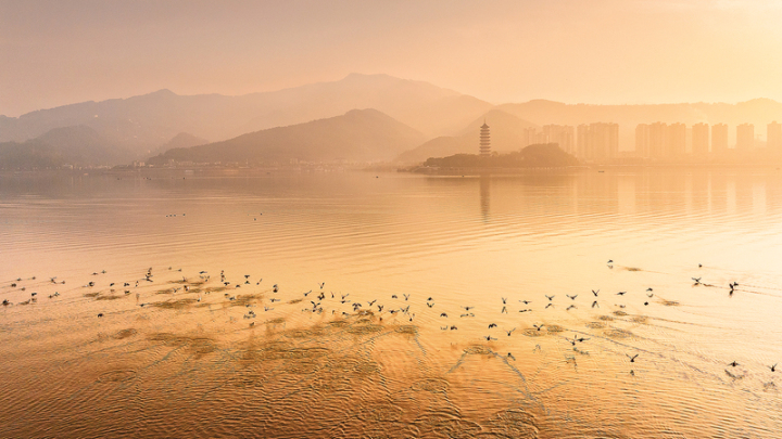 近日,夕阳温柔地洒在汉丰湖上,浮光跃金,水天一色,文峰塔巍峨挺立,塔影婆娑,成群候鸟在湖面上展翅翱翔,巡游嬉戏,与湖光塔影相映生辉,构成了一幅静谧和谐的生态画卷。