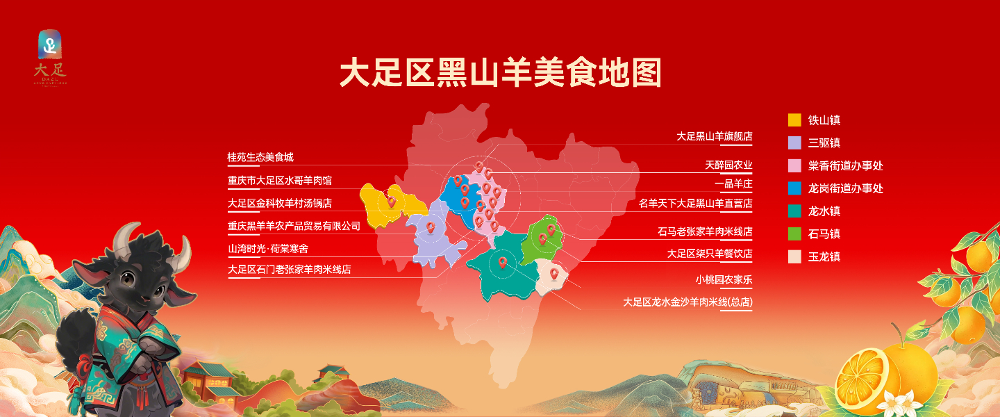 大足黑山羊肉质鲜美、营养价值高、吃法多样,本次发布的大足黑山羊美食地图涉及棠香、铁山、三驱、龙水、石马、玉龙等镇街的14个点位,烤全羊、羊肉汤锅、羊肉米线、羊肉串等黑山羊美食应有尽有。