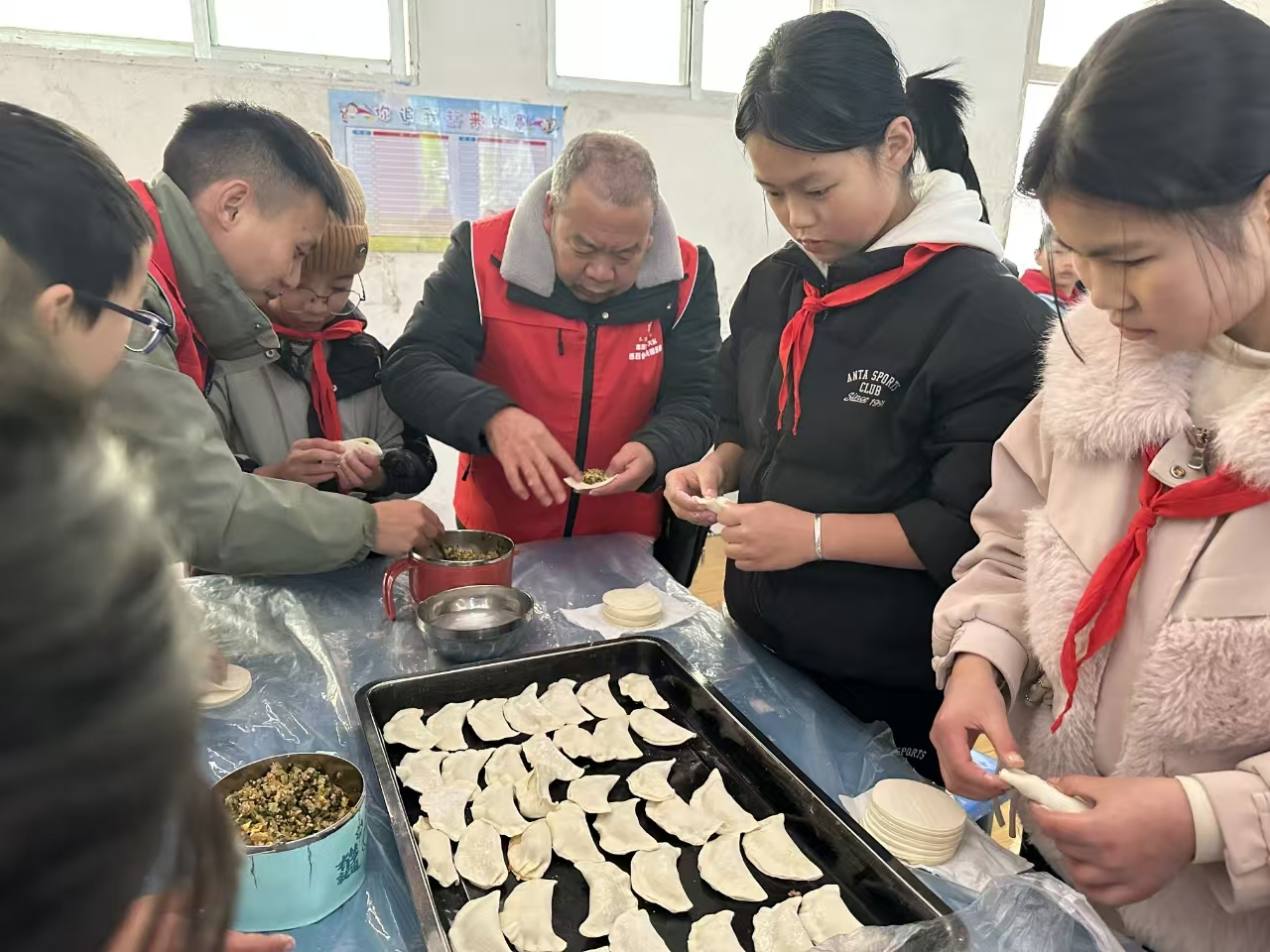 随后,志愿者一行来到中梁小学,与同学们一起包饺子、共度新年。在包饺子过程中,他与同学们亲切交流,鼓励他们努力学习,用知识改变命运。当热气腾腾的饺子端上桌时,整个食堂充满了温馨与欢乐。