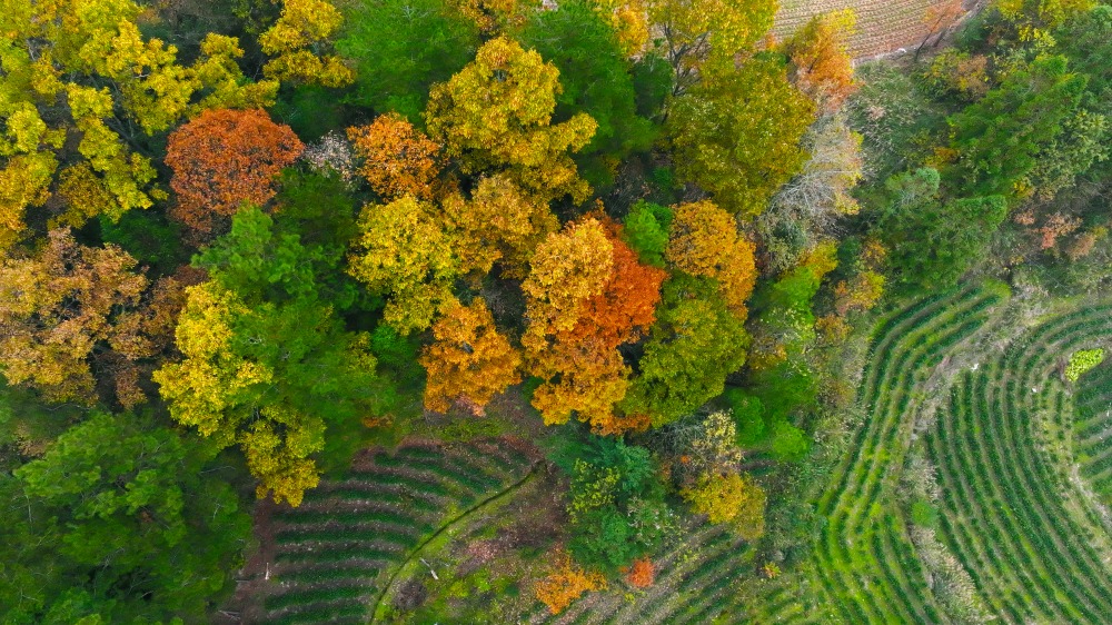 12月3日,黔江区,彩叶林环抱着中塘镇双石村的茶园。