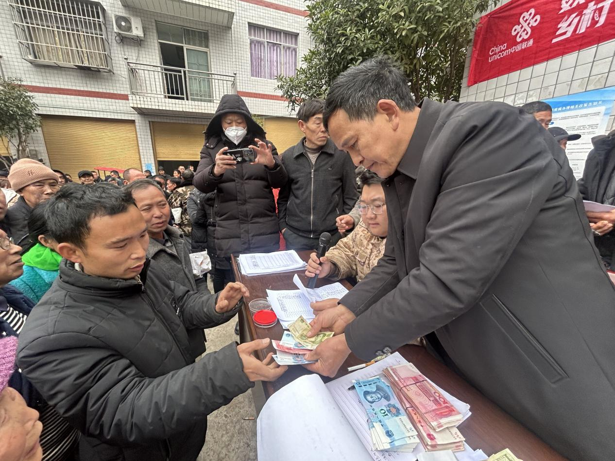 分红大会现场,500余户村民早早地来到会场,每个人的脸上都洋溢着幸福的笑容。在大家的期待中,分红正式开始,工作人员有条不紊地按照流程为村民发放集体经济收益分红款,村民们有序地对照名单核对信息、签字、领取分红,现场气氛热烈而有序。