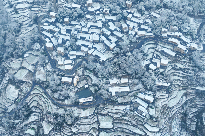1月9日,花田乡何家岩村国家级传统村落迎来瑞雪。雪花纷纷扬扬飘落,村中高低错落的民居,使得雪景层次更为丰富,富有诗情画意。(陈碧生摄)