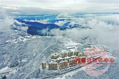 图:石林镇茶园村南天门风力发电场,云雾掩映之下,被白雪覆盖的山川、房屋和风电机组相映成趣,共同构成一幅冬日南国雪原美景图。 记者 王泸州 摄
