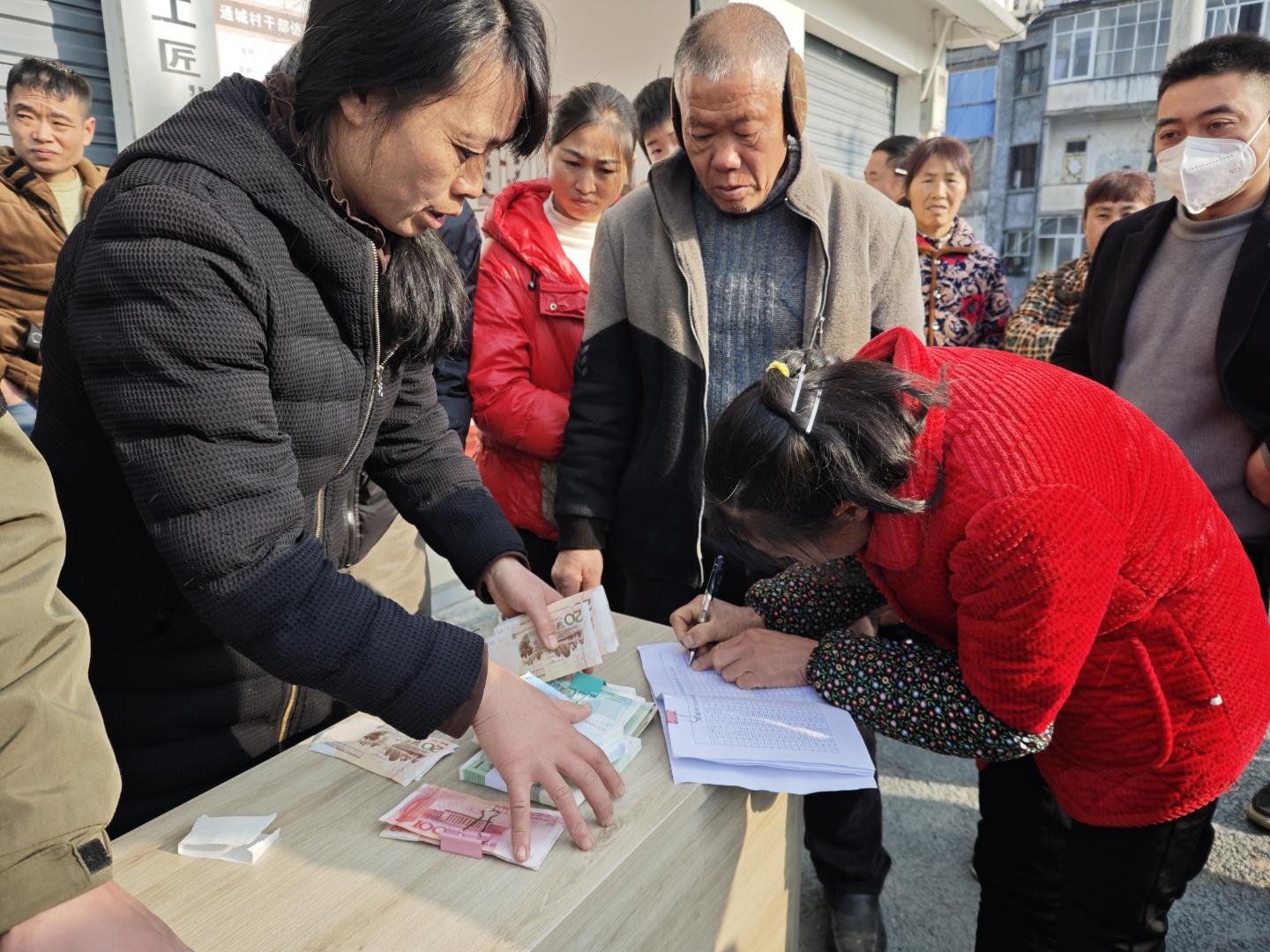 分红现场,村民们喜悦洋溢,工作人员有序核查名单、发放分红款,共计覆盖1828名成员,分红4万余元。截至目前,通城镇6个村已开展分红,惠及9278人,分红38万余元,预计全镇分红总额将超70万元。