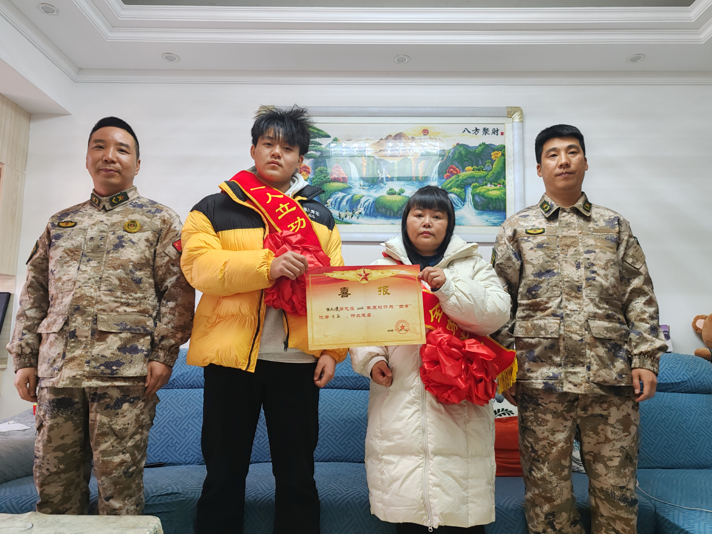 1月20日,宁厂镇武装部、退役军人服务站主要负责人为宁厂镇花栗村荣获“四有”优秀士兵张礼俊荣誉家庭送去喜报,与军属共享荣光。