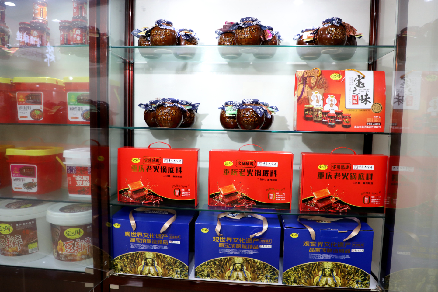 “大足石刻晒缸豆瓣”的酿制工艺源自1920年,传承至今已逾百年。在上世纪90年代,技师们在非遗技艺的基础上增加了熬制工艺,开创了熬制豆瓣酱的先河。如今,为了适应市场需求,宝顶酿造公司将世界文化遗产大足石刻的文化元素融入产品包装,推出了系列调味品礼盒装,深受市场青睐。