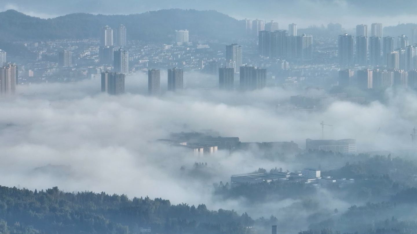 从航拍画面中可以看到,整座城市像是被蒙上了一层薄纱,在雾气中若隐若现,勾勒出朦胧的城市轮廓。晨光初照,雾气从濑溪河畔袅袅升起,城区的高楼大厦、街道,以及远处起伏的山峦,在缥缈的雾气中时隐时现,恰似一幅徐徐展开的山水水墨画。
