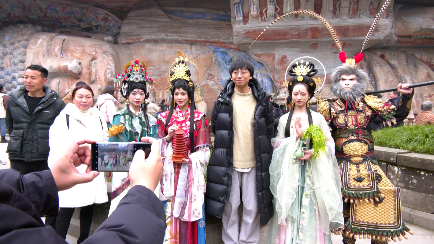 游客杨波:我是从四川过来的,在春晚上看到了大足石刻的节目,就特意实地来看一看,这里的文化氛围确实很浓,真是不虚此行。