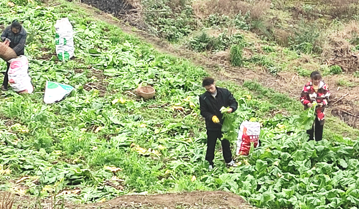 尽管春节的喜庆氛围还未散去,但在梁家湾田间地头已是一派繁忙景象。村民们忙着砍菜头,并将菜头装进口袋,然后扛到就近的公路边,等待商贩开车来收购。