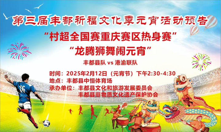 2月12日下午,第三届祈福文化季“龙狮闹元宵”龙狮表演暨元宵节足球盛宴,将在丰都体育场重磅来袭!这可不是一般的活动,它直接把传统非遗和现代竞技锁死,让你一次看个过瘾,体验感直接拉满!