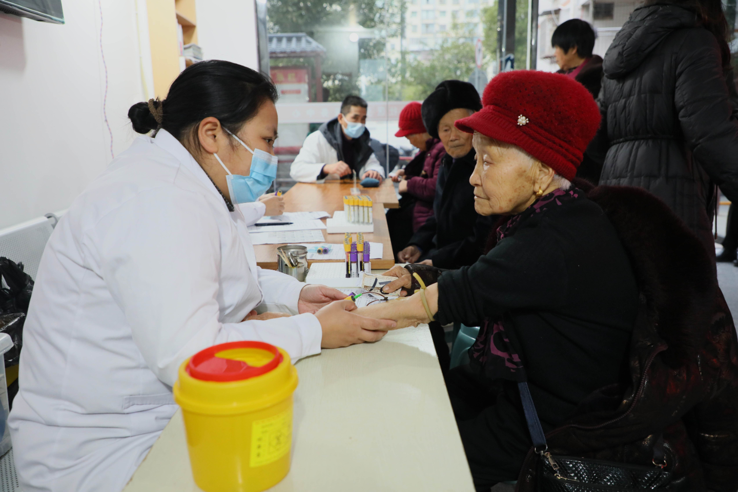 社区干部和志愿者早早来到现场,邀请社区医生为老人提供免费的健康体检。量血压、测血糖、称体重等,并耐心解答老人们的健康疑问,给予贴心的健康建议。