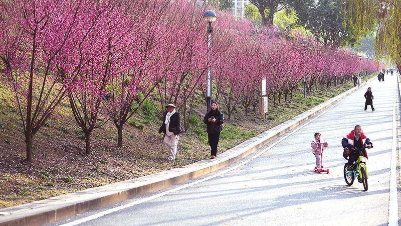 又是一年梅花争艳时。近段时间,在汉丰湖国家湿地公园,大片红梅纷纷绽放,一团团、一簇簇地挂满枝头随风摇曳,或红似火、或粉如霞,成为一道靓丽的风景线,吸引市民寻香打卡。图为市民在汉丰湖国家湿地公园游玩赏花。