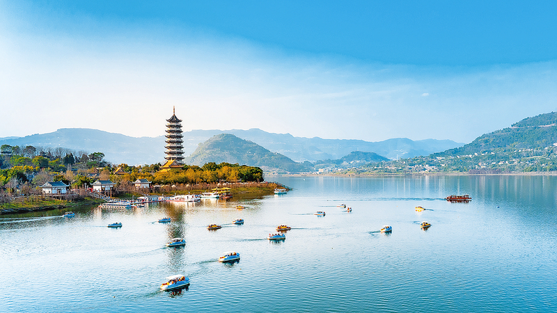 2月22日,汉丰湖水波荡漾,湖畔春意正浓、山色青青,吸引众多市民泛舟游湖,享受春日时光。