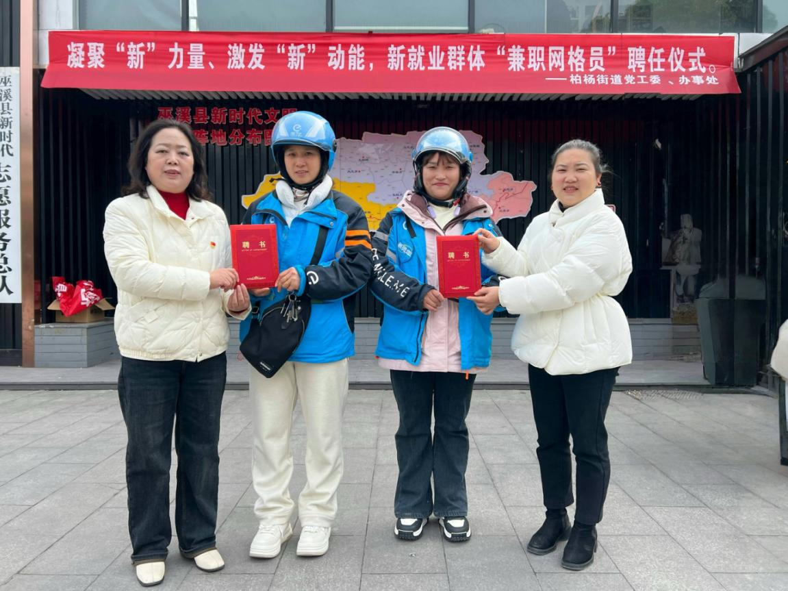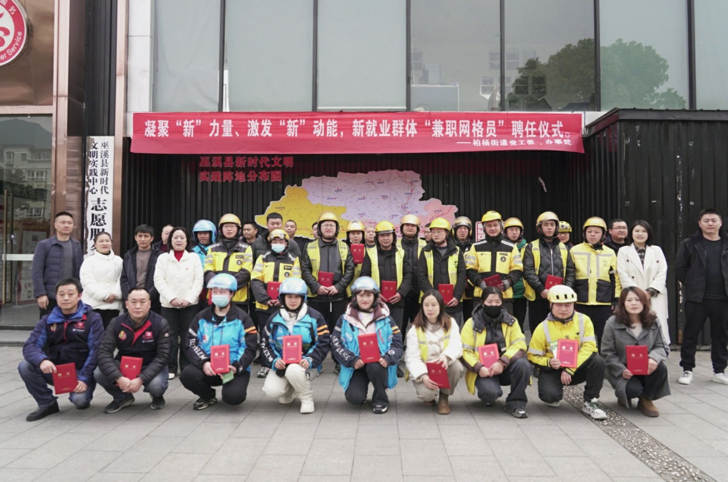 3月6日,柏杨街道党工委在逍遥广场举行新业态、新就业群体 "兼职网格员" 集中聘任仪式,32 名快递员、外卖骑手、网约车司机等新就业群体代表获颁聘书,正式加入基层治理队伍。