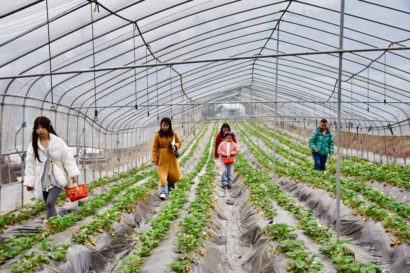 在花坝村,不仅可以赏花,还可以体验采摘的乐趣。在草莓园里,个大饱满、色泽喜人的草莓散发着诱人的香气,游客们手提篮子,穿梭其中,一边采摘,一边享受着与亲朋好友的悠闲时光。