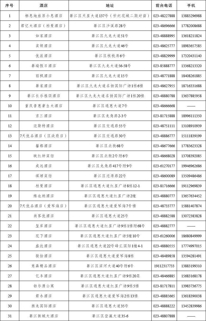▲綦江城区部分酒店地址及联系方式