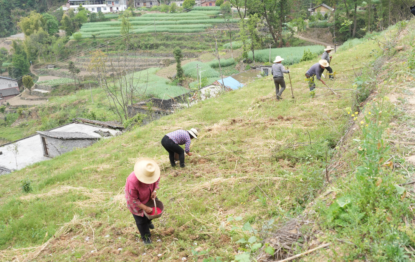 4月9日,在茶山村玉米种植基地,记者看到,群众拿着锄头穿梭在田间地头,打窝、播种、盖土……大家分工忙碌、干劲十足。