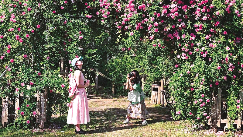 漫步盛山植物园内,恣意盛开的蔷薇花爬满拱形花架,一团团、一簇簇,远远望去犹如艳丽夺目的锦缎,在阳光的照耀下熠熠生辉、分外美丽。微风拂来,花香沁人心脾,花瓣片片散落,铺就了一条粉色花路,让人仿佛置身春日童话世界。