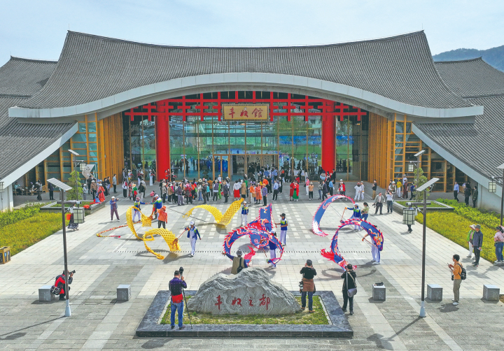 近年来,包鸾镇利用当地得天独厚的自然资源及人文景观,打造了集餐饮住宿、生态农业、森林康养等多元服务于一体的石里红枫景区,吸引众多游客打卡游玩,有效助推乡村振兴。图为包鸾镇飞仙洞村石里红枫度假区,游客在舞龙健身。
