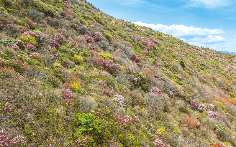 近段时间,在海拔1800多米的重庆雪宝山国家级自然保护区内,高山杜鹃迎来盛花期,淡粉、胭红的花朵将连绵峰峦染成了斑斓锦缎。